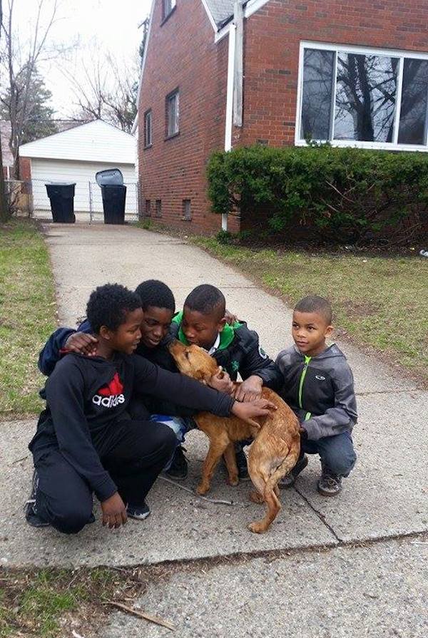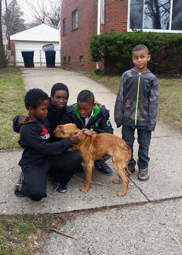 After Detroit Pit Crew explained to the kids that they could get Sparkle to the vet and find her a home, the boys were very happy. One kid said rescuing the dog made him “feel great”.