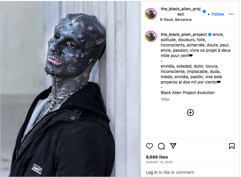 Black Alien fantasized about leaving Montpellier, France, and traveling to other nations in Europe. The aim? to observe how individuals from various cultures perceive him and respond to his alien appearance. Additionally, he plans to experiment with tattooing eyes and videotape their reactions.