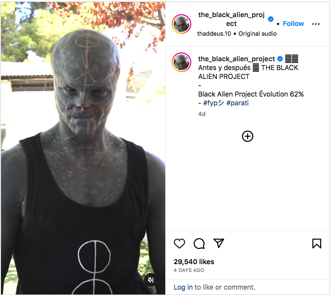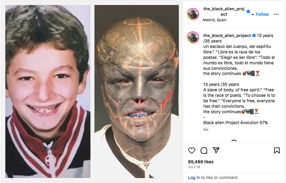 Black Alien currently has black lines tattooed all over his body, black lines on his face, his tongue split like a lizard, and an unusual tattoo that makes his eyes black.