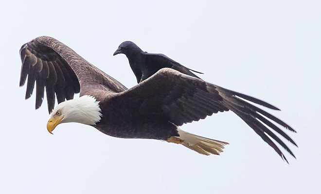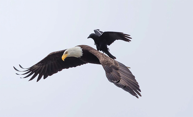 The crow seems to be more cunning than people think. And it turns out that birds can also get tired. The crow was tired of flapping its wings and actually decided to sit on the eagle’s back. And the interesting thing was that the eagle didn’t seem to be against all this. Fortunately, the photographer managed to capture all that. The video quickly spread on the Internet and had many views.