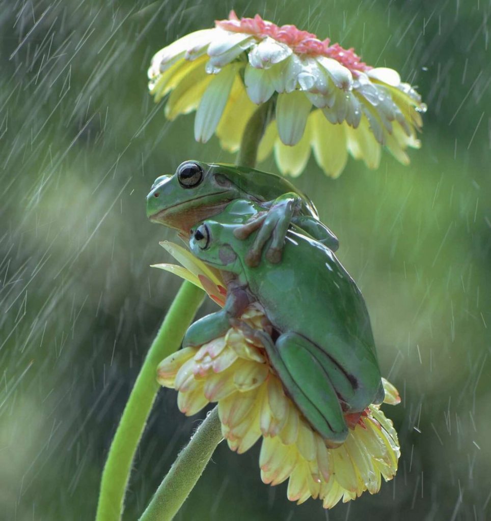 It was a pouring rain when the talented photographer grabbed his camera and went through the deep forest to search for some once-in-a-lifetime frames. Gratefully his efforts paid off when he spotted two frogs that turned a flower into an umbrella to shelter them from the heavy rain.